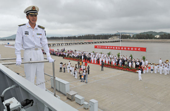 5月9日,“舟山”艦艦長(zhǎng)楊黎明指揮軍艦?看a頭。新華社記者 范軍威 攝