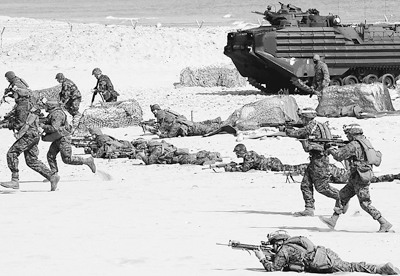 3月29日,在韓國慶尚北道浦項(xiàng),士兵在進(jìn)行登陸演習(xí)!岸d鷲”韓美聯(lián)合野外機(jī)動(dòng)演習(xí)于3月1日開始,到4月30日結(jié)束。新華社發(fā)