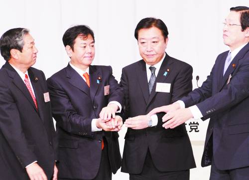 9月21日,日本首相野田佳彥(右二)在日本首都東京舉行的民主黨代表(黨首)選舉上與其他候選人握手。野田佳彥當(dāng)日在執(zhí)政的民主黨代表選舉中擊敗競選對(duì)手,獲得連任。