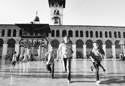 敘利亞兒童在大馬士革的倭瑪亞清真寺前玩耍。