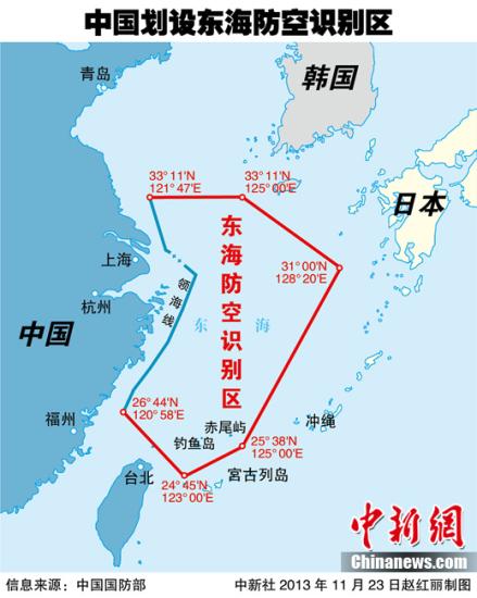 11月23日,中國國防部網(wǎng)站公布東海防空識別區(qū),具體范圍為是以該網(wǎng)站公布的六點坐標(biāo)的連線與中國該區(qū)域領(lǐng)海線之間空域。關(guān)于“東海防空識別區(qū)航空器識別規(guī)則”也同時公布,該規(guī)則自2013年11月23日10時起施行。信息來源:中國國防部