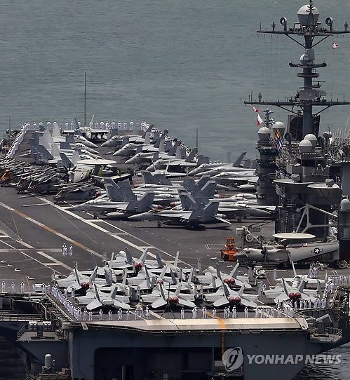 美國第七艦隊(duì)的核心戰(zhàn)艦——核動力航母“喬治·華盛頓號”11日下午駛?cè)腠n國釜山港。(圖片來源:韓聯(lián)社)