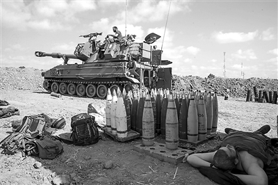 7月13日,在以色列南部與加沙的邊境,一名以軍士兵在一門(mén)自行榴彈炮旁午休。新華社發(fā)
