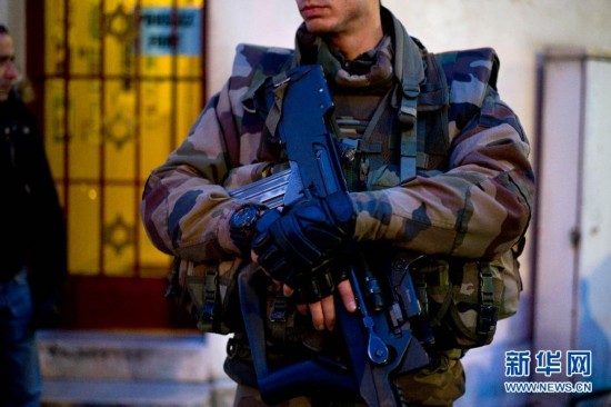 1月21日,在法國(guó)首都巴黎城外的一個(gè)猶太教堂前,一名法軍士兵持槍警戒。法國(guó)巴黎《沙爾利周刊》雜志社1月7日遭恐怖襲擊后,法國(guó)政府立即加大安保工作力度。襲擊發(fā)生的當(dāng)天下午,法國(guó)總理府宣布,將首都所在的整個(gè)巴黎大區(qū)反恐預(yù)警方案“警惕海盜計(jì)劃”的警戒級(jí)別提至最高,并進(jìn)一步加強(qiáng)對(duì)新聞機(jī)構(gòu)、大型商場(chǎng)、交通系統(tǒng)和宗教場(chǎng)所的保護(hù)。法國(guó)反恐預(yù)警方案“警惕海盜計(jì)劃”的安全警戒級(jí)別有4級(jí),政府總理有權(quán)根據(jù)實(shí)際情況和需要宣布或調(diào)整國(guó)家所處的警戒級(jí)別。目前,在法國(guó)全境執(zhí)行國(guó)內(nèi)安全任務(wù)的軍人已增加到1萬(wàn)人以上,其中大約8000人執(zhí)行“警惕海盜計(jì)劃”。機(jī)場(chǎng)、車站和著名旅游景點(diǎn)等重要公共場(chǎng)所都加強(qiáng)了軍人值勤的部署力度。這是法國(guó)首次在本土動(dòng)員如此多的軍人參與安保。新華社發(fā)