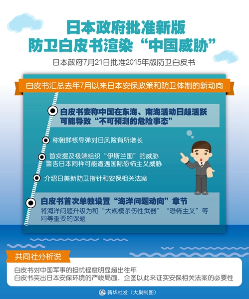 新華網(wǎng)北京7月22日電(記者趙悅 沈紅輝)日本政府21日批準(zhǔn)2015年版防衛(wèi)白皮書(shū),加碼炒作“中國(guó)威脅論”,制造緊張氣氛,為強(qiáng)化安保政策、發(fā)展防衛(wèi)體制并密切日美軍事同盟尋找借口。