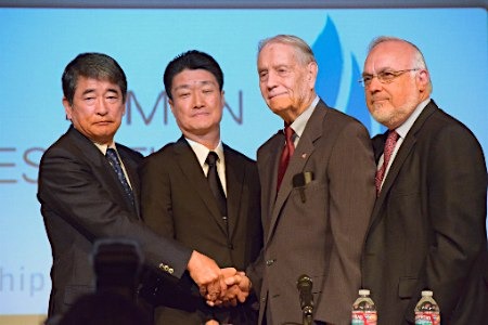 圖為三菱公司兩名高層(左側(cè)兩人)與二戰(zhàn)美國士兵握手。(資料圖)