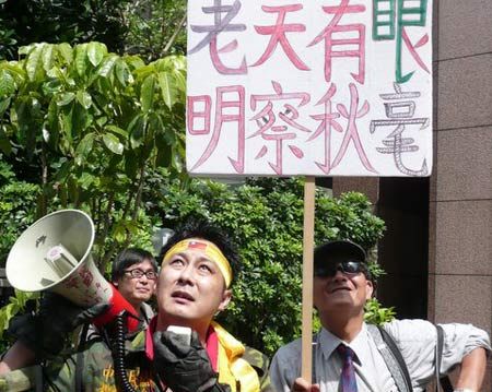 2名男子日前手持標(biāo)語和擴(kuò)音器專程嗆扁,抗議陳水扁A錢。