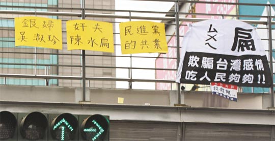臺中市文心路及大雅路口的天橋上,日前出現(xiàn)“銀婦吳淑珍、奸夫陳水扁”、“欺騙臺灣感情,吃人民夠夠”海報(bào)及布條,讓人側(cè)目。(臺灣《聯(lián)合報(bào)》圖)