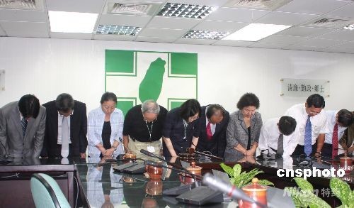 迫于島內(nèi)公眾壓力,陳水扁8月15日下午發(fā)表書面聲明表示其夫婦退出民進(jìn)黨。民進(jìn)黨傍晚召開臨時(shí)中常會(huì),會(huì)后黨主席蔡英文宣讀聲明稿,表示接受陳水扁夫婦退黨,并帶領(lǐng)所有民進(jìn)黨中常委透過媒體向臺(tái)灣公眾鞠躬道歉。(圖片來源:中新社)
