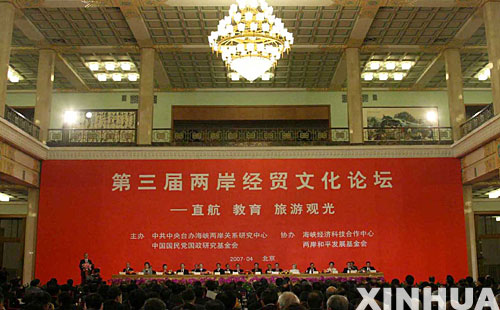 2007年4月28日,第三屆兩岸經(jīng)貿(mào)文化論壇在北京人民大會(huì)堂開幕。(新華社)