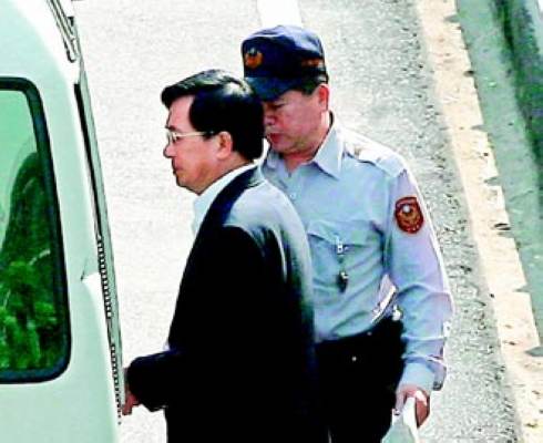 臺北地方法院審理“公務機要費”案,4月28日傳訊前陳水扁辦公室出納陳鎮(zhèn)慧和陳水扁首度對質(zhì)。陳水扁(左)由法警押解步上警備車。(網(wǎng)絡圖)