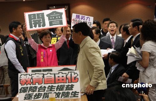 5月4日上午,臺(tái)“立法院”原定審查事關(guān)大陸學(xué)歷認(rèn)證、開(kāi)放大陸學(xué)生來(lái)臺(tái)的兩岸人民關(guān)系條例部分條文修正草案。圖為民進(jìn)黨“立委”反鎖會(huì)議室、占據(jù)主席臺(tái)后,國(guó)民黨“立委”舉起要求正常開(kāi)會(huì)的標(biāo)語(yǔ)牌。 中新社發(fā) 耿軍 攝