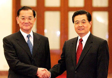 2005年4月29日下午3時(shí),中共中央總書記胡錦濤與中國(guó)國(guó)民黨主席連戰(zhàn)那一次歷史性的握手。(來源:新華網(wǎng))