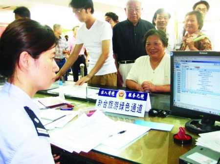 2008年7月14日,青島市出入境管理局,“赴臺旅游綠色通道”前臺民警正在為申請赴臺游的居民辦理手續(xù)。