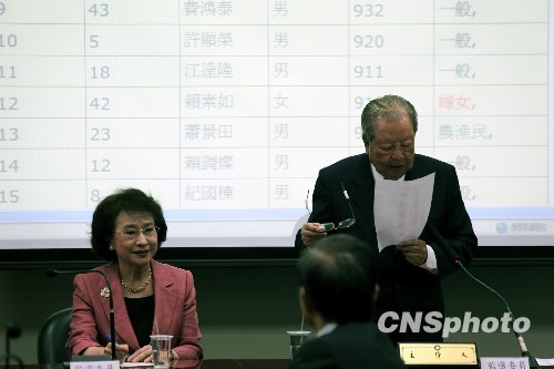 中國國民黨第十八屆第一任中央常務(wù)委員11日傍晚出爐。除7席為指定中常委外,其余32席經(jīng)選舉產(chǎn)生。圖為國民黨中央監(jiān)選委員召集人邱創(chuàng)煥(右)、林澄枝(左)公布32位票選中常委名單。(圖片來源:中新社)