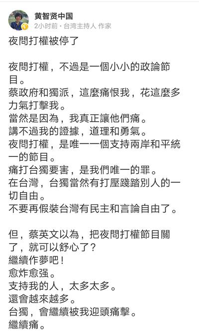 6月27日上午,臺(tái)灣知名媒體人黃智賢在網(wǎng)絡(luò)平臺(tái)發(fā)文說,她主持的政論節(jié)目《夜問打權(quán)》被停播了,“蔡當(dāng)局和‘獨(dú)派’這么痛恨我,花這么多力氣打擊我,當(dāng)然是因?yàn)槲艺嬲屗麄兺矗麄冎v不過我的證據(jù)、道理和勇氣!