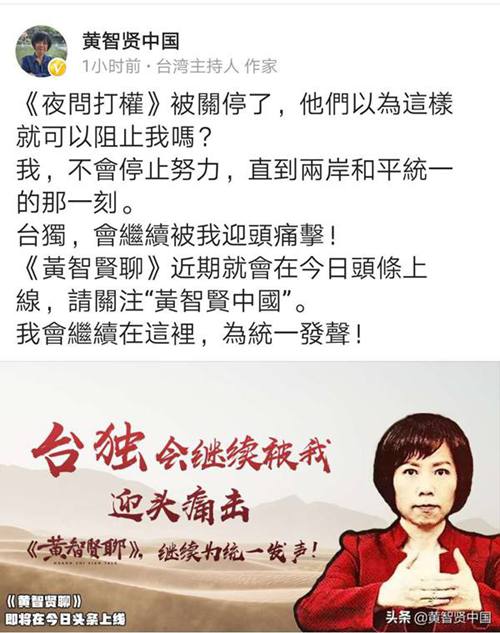 6月27日下午,黃智賢繼續(xù)在網(wǎng)絡(luò)平臺(tái)發(fā)文,宣布新節(jié)目《黃智賢聊》近期將會(huì)上線,她會(huì)繼續(xù)為統(tǒng)一發(fā)聲。黃智賢還表示:蔡英文以為把《夜問打權(quán)》關(guān)了就可以阻止我嗎?支持我的人太多太多,還會(huì)越來越多,我不會(huì)停止努力,直到兩岸和平統(tǒng)一的那一刻,“臺(tái)獨(dú)”會(huì)繼續(xù)被我迎頭痛擊!