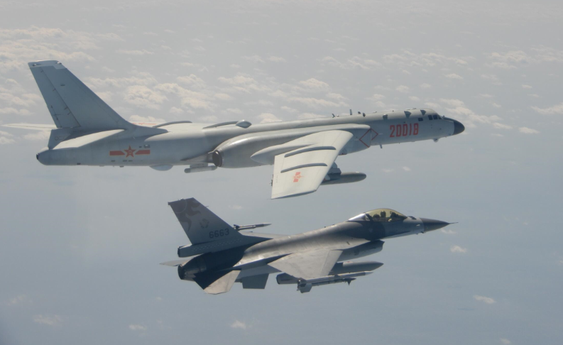 臺軍公布臺灣空軍F-16戰(zhàn)機掛彈攔截監(jiān)視我轟-6K的照片。