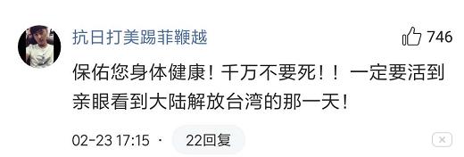 對于李登輝此次入院,大陸網(wǎng)友也“十分關(guān)切”。不少網(wǎng)友在留言中表示,希望臺灣方面能夠?qū)ζ淙尵龋碛蓜t是一定要讓這位老牌“臺獨”分子,親眼目睹祖國統(tǒng)一的到來。