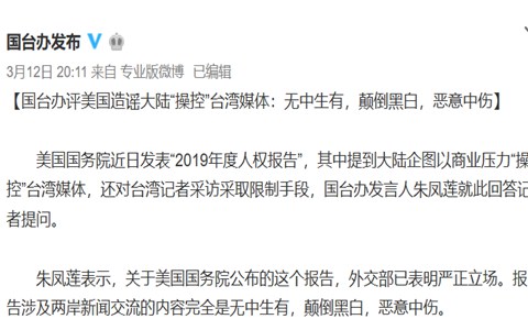 美國(guó)國(guó)務(wù)院近日發(fā)表“2019年度人權(quán)報(bào)告”,竟然提到“大陸企圖以商業(yè)壓力‘操控’臺(tái)灣媒體,還對(duì)臺(tái)灣記者采訪采取限制手段”等無(wú)中生有的事情,國(guó)臺(tái)辦發(fā)言人朱鳳蓮12日回應(yīng)時(shí)做了以上表示。