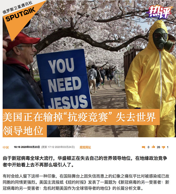 俄羅斯媒體23日評論稱,美國正在輸?shù)艨共《靖傎,失去世界領(lǐng)導(dǎo)地位;美國《紐約時(shí)報(bào)》同一日的報(bào)道也認(rèn)為“美國正在進(jìn)一步后退,放棄自己長期以來的角色”。