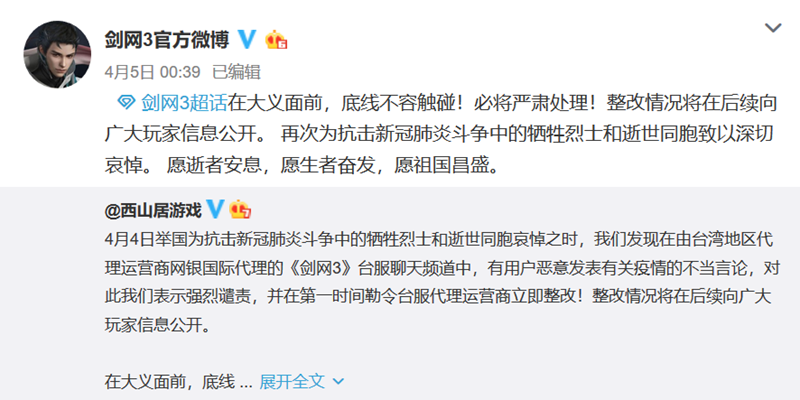 這個(gè)事件的起因,其實(shí)很簡(jiǎn)單。就是4月4日全國(guó)范圍內(nèi)的清明哀悼日,暫停一切娛樂(lè)活動(dòng),惹毛了“劍網(wǎng)3”的某些臺(tái)灣玩家。