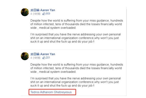 此外,臺(tái)灣知名藝人炎亞綸竟然也加入了對(duì)譚德塞的斥責(zé)。9日中午,炎亞綸在其臉書以英文指責(zé)譚德塞“誤導(dǎo)”世界,還指責(zé)稱“你竟然有勇氣在一次國(guó)際組織會(huì)議上發(fā)表你自己個(gè)人的屎一樣的言論”,“你為什么不干脆閉嘴、閉上你的臭嘴,做好自己的工作!”同時(shí)附上了譚德塞臉書的鏈接,隨后他又對(duì)貼文進(jìn)行編輯,去掉了此鏈接。