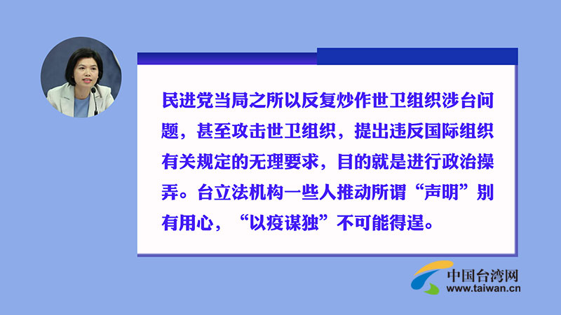 絞盡腦汁想在國(guó)際舞臺(tái)秀“存在感”的民進(jìn)黨當(dāng)局,每逢世界衛(wèi)生大會(huì)就開始演戲,這次疫情期間也不例外。民進(jìn)黨當(dāng)局立法機(jī)構(gòu)曾與2月21日通過所謂“共同聲明”,提出讓世衛(wèi)組織“以完整無(wú)礙的制度化方式接納臺(tái)灣參與WHO的運(yùn)作”的無(wú)理要求。對(duì)此國(guó)臺(tái)辦發(fā)言人朱鳳蓮作出回應(yīng):民進(jìn)黨當(dāng)局之所以反復(fù)炒作世衛(wèi)組織涉臺(tái)問題,甚至攻擊世衛(wèi)組織,提出違反國(guó)際組織有關(guān)規(guī)定的無(wú)理要求,目的就是進(jìn)行政治操弄。臺(tái)立法機(jī)構(gòu)一些人推動(dòng)所謂“聲明”別有用心,“以疫謀獨(dú)”不可能得逞。