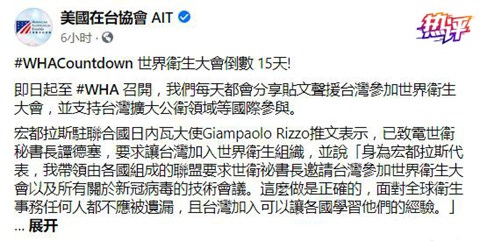 美國對(duì)世衛(wèi)組織(WHO)的“嫌棄”,舉世皆知。美國總統(tǒng)特朗普幾個(gè)月來一直指責(zé)世衛(wèi)組織對(duì)新冠肺炎疫情防控不力,前不久更是直接宣布斷絕對(duì)世衛(wèi)組織的資助。但在距離世衛(wèi)大會(huì)(WHA)舉行倒數(shù)15天的時(shí)候,“美國在臺(tái)協(xié)會(huì)”(AIT)卻在宣布:將每天分享貼文,聲援臺(tái)灣參加世衛(wèi)大會(huì),并支持臺(tái)灣擴(kuò)大國際參與。