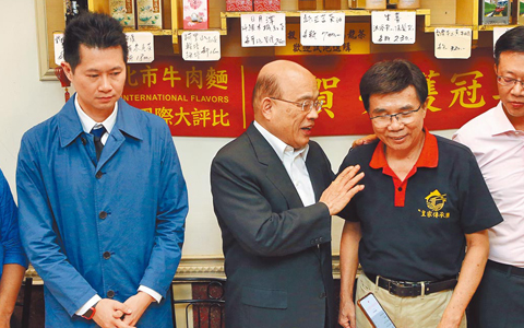 針對行政部門發(fā)言人丁怡銘發(fā)言引發(fā)牛肉麵風波,臺行政部門負責人蘇貞昌(中)日前帶著丁怡銘(左)前往皇家牛肉面店用餐,向老板(右) 表達歉意。(圖片來源:網絡)