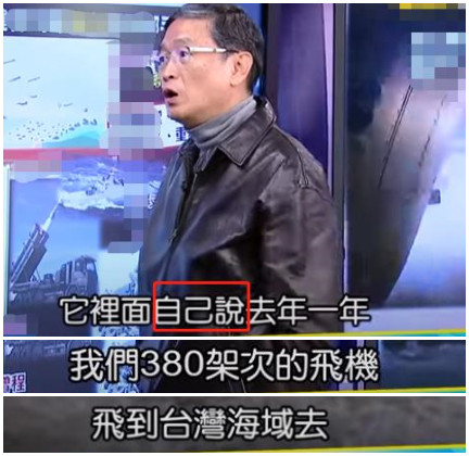 第三,在報道大陸媒體涉臺內容時,綠媒還常常會在細節(jié)處做“微調”,比如同一期節(jié)目中,嘉賓聲稱,文章“自己說”,“去年一年我們380架次的飛機飛到臺灣海域。”
