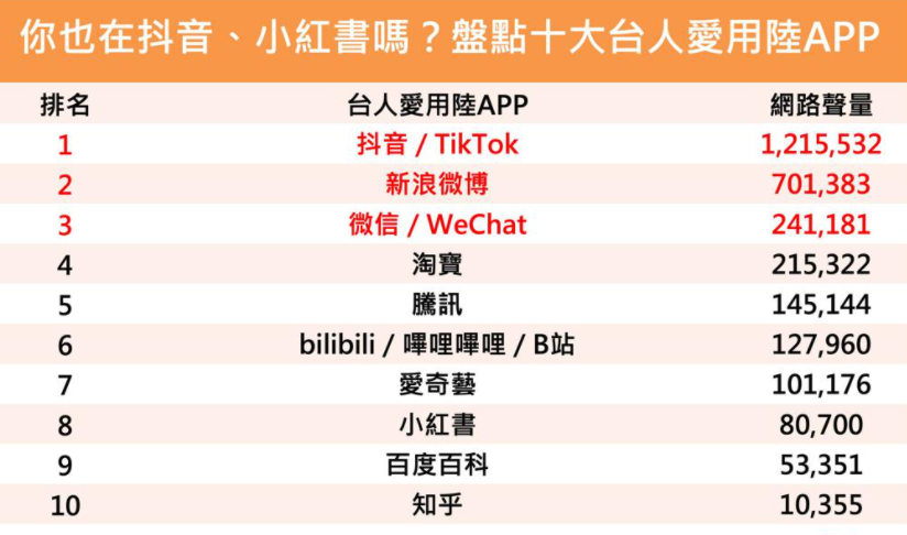 近年來,不少臺灣同胞在日常生活中開始使用大陸APP,從社交、購物到影音平臺,內(nèi)容十分豐富。最近,島內(nèi)一家網(wǎng)站通過網(wǎng)絡調(diào)查,評選了島內(nèi)網(wǎng)友愛用的十款大陸APP。公布的榜單顯示,位列前三的依次為抖音、新浪微博、微信,另外七個則是淘寶、騰訊、嗶哩嗶哩、愛奇藝、小紅書、百度百科和知乎。上述十款在大陸幾乎是裝機必備的APP,如今同樣也是島內(nèi)網(wǎng)友青睞的熱門應用軟件。