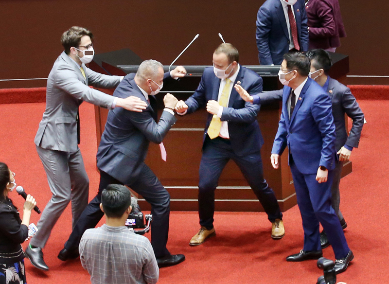 據(jù)報(bào)道,這兩名參訪團(tuán)員身著西裝、面對(duì)面擺起拳擊場(chǎng)上的對(duì)峙姿勢(shì),作勢(shì)扭打;而其他議員也“融入”假裝上前勸架,一行人玩得十分開心并留影紀(jì)念。對(duì)此,陪同參訪的綠營(yíng)民代稱:“對(duì)方是用這種方式來表達(dá),民主本來就是多元,訪問團(tuán)對(duì)臺(tái)灣的民主是很肯定的!辈簧倥_(tái)媒竟然還反以為榮,以“名揚(yáng)國(guó)際”“打架超紅”“國(guó)際認(rèn)證”“臺(tái)灣印象”為題報(bào)道此新聞。