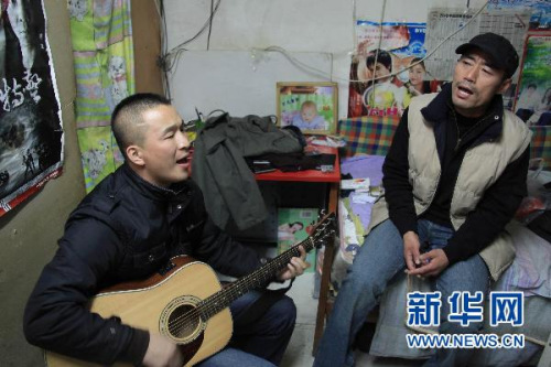 王旭(右)和劉剛在出租屋內(nèi)唱歌。新華社記者 邢廣利 攝