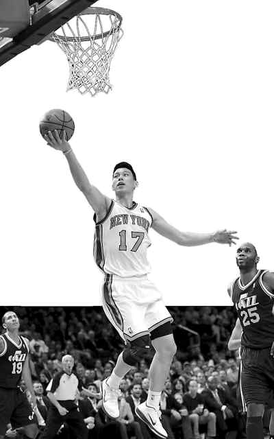 林書豪在與爵士隊的比賽中上籃。