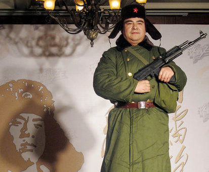 頭戴雷鋒帽、身穿軍大衣、手握鋼槍,昨天,“中國首善”陳光標一身標準“雷鋒”裝扮亮相湖南衛(wèi)視《鋒尚之王》節(jié)目錄制現(xiàn)場。(3月4日騰訊網(wǎng))