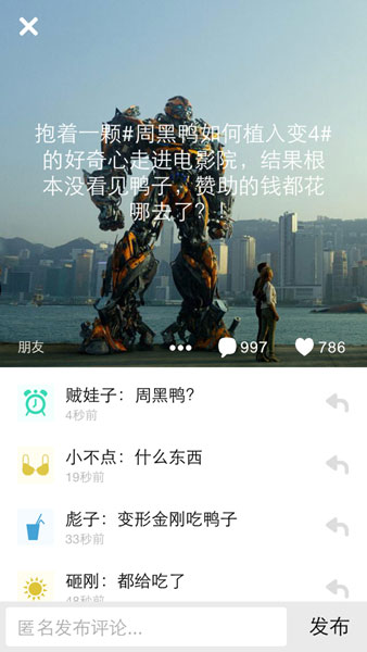 以往觀眾看完電影后都選擇上微博,天涯,豆瓣等地兒進行吐槽,深思熟慮“吐”出水平實屬不易,不同于微博上面的中性評價,匿名社交平臺上面吐槽更加無下限,尤其是目前在匿名社交中大熱的烏鴉成為了大家吐槽的新寵,可以毫無心理包袱的無下限吐槽滿足了大家新的宣泄需求。