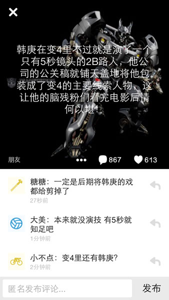 隨著匿名社交的興起,大家不再滿足于在微博,天涯,豆瓣等地進行吐槽了,在烏鴉上面,觀眾,尤其是圈內(nèi)人士不再顧忌工作關系,和其他社交平臺相比,他們的宣泄更加肆無忌憚和無下限,也許未來嗅覺靈敏的公關團隊就會將合作業(yè)務拓展到匿名社交了。