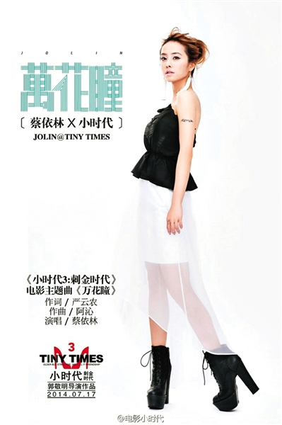 “還記得去年夏天《小時代》帶來的音樂狂潮嗎?”在這一輪電影主題歌的牌局開始之前,郭敬明已通過微博以“完形填空”的形式預告了《小時代3》的歌曲名單。雖然彼時部分演唱者與作詞人被涂黑,頗具懸念,而早在六月中旬,郭敬明就親自請出了曾被冠名為“宇宙天后”的蔡依林。這首由蔡依林全程跟進,飛兒樂團阿沁作曲,嚴云農填詞的《萬花瞳》占得先機。值得一提的是,“后青澀的愿景 蛻變前的追尋”“若生命是倒影,宇宙是面棱鏡”“在定義下個時代”等歌詞頗為博得小四歡喜,頗為挑剔的他對該作品竟是一字未改。三天之后,韓寒《后會無期》跟進,憑借“東極島啊你人杰又地靈太平洋的風兒最先吹到你”等詼諧的歌詞,《東極島之歌》迅速抓住歌迷耳朵。這首作品原曲出自2006年由薩莎·拜倫·科恩主演的《波拉特》電影原聲,韓寒親自在作曲者基礎上填詞,并將其定義為“島歌”,噱頭十足。