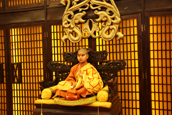 下午五點,北京紅劇場內(nèi)《功夫傳奇》下午場演出即將開始,觀眾陸續(xù)進(jìn)場。演出大廳門口,一個小和尚正在坐禪,手執(zhí)木魚,念念有詞。這是《功夫傳奇》極具特色的迎賓儀式,也是中國功夫注重“禪武雙修”的最直觀表現(xiàn)。前來看演出的觀眾們興致勃勃地與小和尚合影留念。