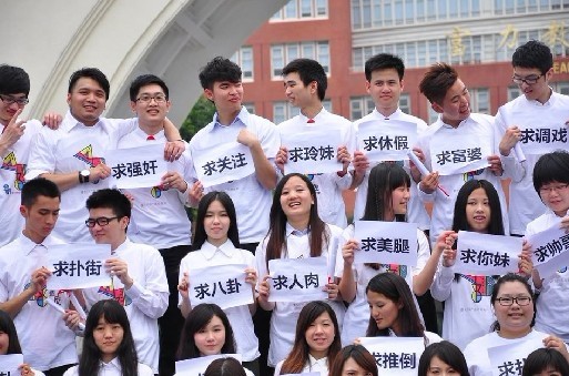 我們不妨通過照片解讀一下這些“天之驕子”在內(nèi)心深處的表白,一個(gè)男孩子也敢于高舉“求強(qiáng)奸”的橫幅躋身于一群同處幾年的異性之中;蛟S我們可以認(rèn)為他是校園的愛情的失敗者,在面對(duì)成雙入對(duì)的校園風(fēng)景里他感受到了失落;亦或許是他對(duì)于所謂的“高、帥、富”的嫉妒與對(duì)真愛的渴求。如今,即便在象牙塔下,校園的愛情也遭受了金錢的侵襲,相對(duì)封閉的校園已經(jīng)接受了社會(huì)化的融入。