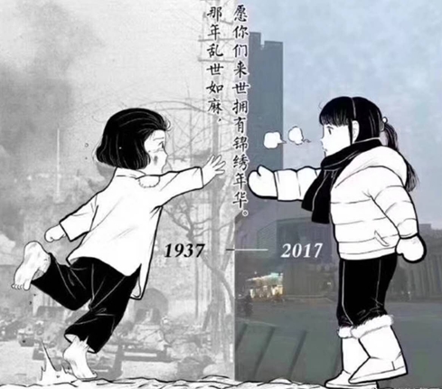 一邊是1937年,遍地烽火;一邊是2017年,盛世繁華。隔著時空的兩個小女孩,一邊衣衫襤褸、滿臉恐慌;一邊羽絨服雪地靴,幸福滿滿。她們都將手伸向?qū)Ψ,滿眼渴望。圖片中間的一行字,更是像針一樣刺向每位觀者的心——