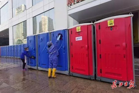 方艙醫(yī)院改建自體育館、展覽中心,本身具備衛(wèi)生設(shè)施;為了滿足需求,工作人員還為各個(gè)方艙醫(yī)院緊急大量安裝移動(dòng)廁所。(圖片來(lái)源:長(zhǎng)江日?qǐng)?bào))