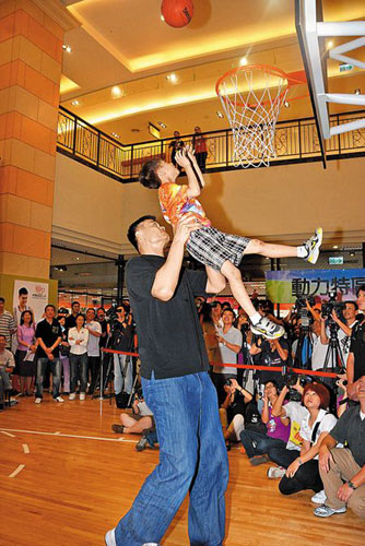 姚明26日晚上到義大世界與小球迷親密接觸,當(dāng)場將小朋友抱起來灌籃。(圖片來源:臺灣《中國時報》)