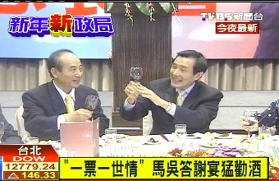據(jù)臺灣TVBS網(wǎng)站報道,馬英九和吳敦義1日晚出席感恩餐會,答謝競選干部在選戰(zhàn)過程中的幫助,馬英九深深三鞠躬表達感激,并說“一張票一世情”。不過,馬吳二人真的太開心,吳敦義在現(xiàn)場猛勸酒,不知道是不是多喝了,馬英九離開餐會的時候,講話變得好輕柔。