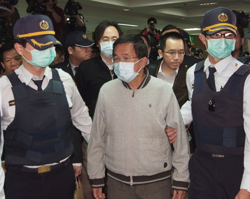 陳水扁(前中)獲準(zhǔn)戒護(hù)外醫(yī),7日清晨在兒子陳致中(后右)陪同下進(jìn)入桃園醫(yī)院檢查。圖片來源:臺灣“今日新聞網(wǎng)”