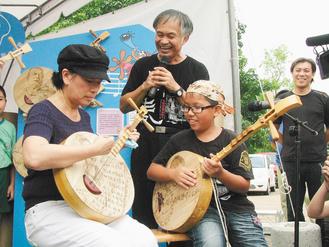 龍應(yīng)臺(左)7日到苗栗縣桐花公園客家大院,為文化行動列車授旗,現(xiàn)場學(xué)彈月琴、唱恒春民謠。圖片來源:臺灣《聯(lián)合報》