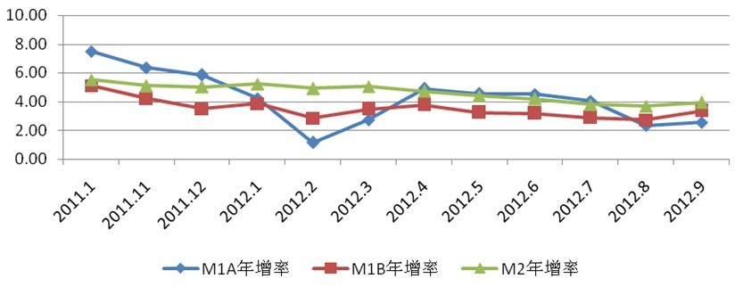 2012年1-9月 M2年增率為4.44%,M1A年增率為3.45%,M1B年增率為3.26%。