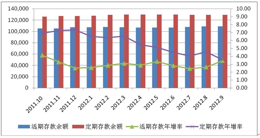 2.金融機構(gòu)存款增速先升后降,定期存款增速幅度下降明顯。臺灣金融機構(gòu)存款年增率由2011年12月的4.18%小幅度上升至2012年3月的4.70%,其后逐步下降至9月的3.18%最低值。不同類別的存款皆出現(xiàn)正增長,但增長幅度差異較為明顯。其中活期存款增速較為穩(wěn)定,一直維持在3%左右,占存款總額的比重由1月的32.89%小幅上升至9月的33.18%;定期存款年增率則出現(xiàn)明顯下滑趨勢,年增率由1月的6.5%逐步下降至9月的3.53%,占存款總額的比重則先升后降最后略有回升,由1月的39.25%小幅增加到9月的39.35%。