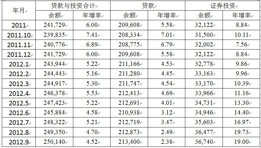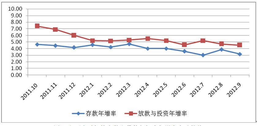 3.金融機構(gòu)貸款與投資增速下降,證券投資年增率大幅上揚。2012年1-9月臺灣金融機構(gòu)貸款與投資余額依舊保持正增長態(tài)勢,貸款與投資余額由1月的243944新臺幣億元增加到9月的250140億元,但年增率呈下降趨勢,主要是經(jīng)濟形勢不佳所致。其中貸款量相對平穩(wěn),年增率由1月的4.53%逐步下降至9月的2.38%;而證券投資每月平均年增率卻呈現(xiàn)大幅上揚趨勢,由1月的9.86%逐步上升至9月的19.00%。存貸款年增率差距在7月間達到最大,其它時間都維持在2%以內(nèi)。